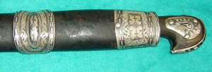 Шашка черкесская 1308 г. по хаджире, 1881 г. григорианский. Серебряный и золотой галун. На всех серебряных элементах ножен клейма: 84, Егорий скачет вправо и буква М. Подпись мастера, на клинке владельческие надписи.