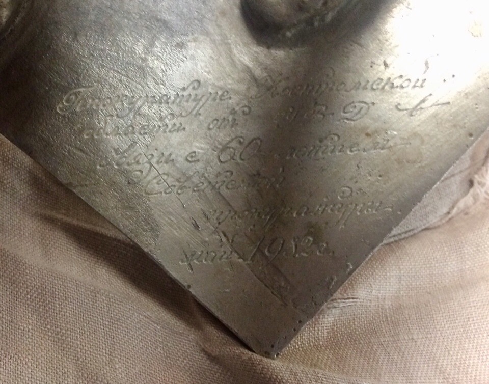 На плинте надпись "Прокуратуре Костромской области от УВД в связи с 60-летием Советской прокуратуры. Май 1982 г."