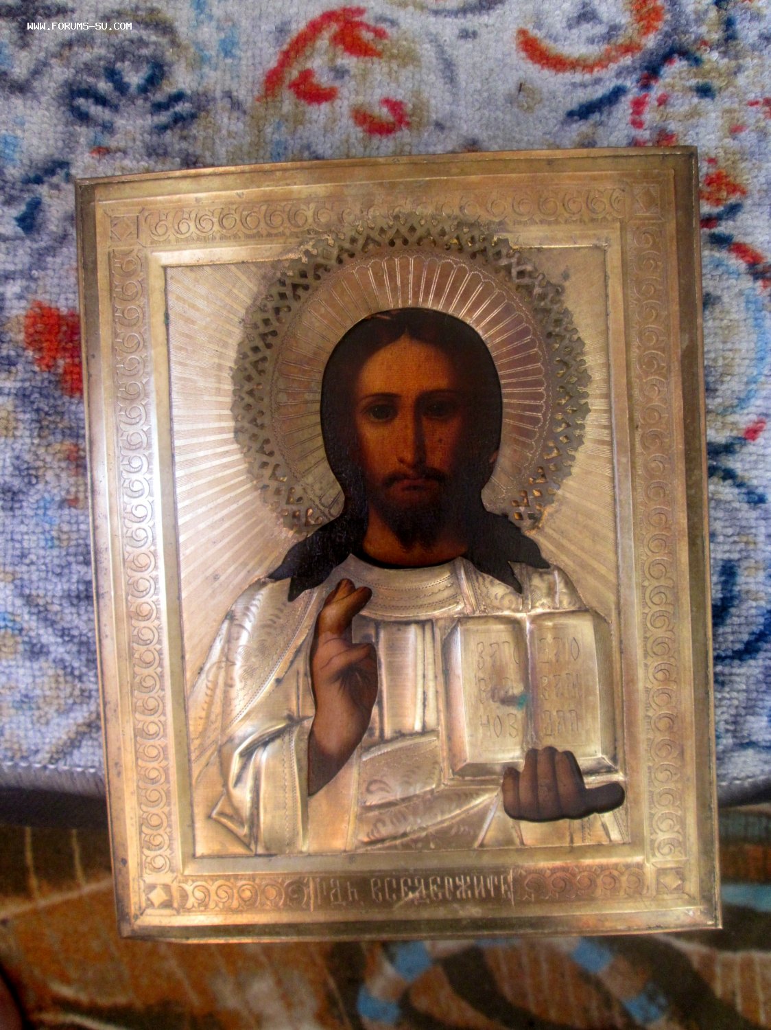 Икона Господь Вседержитель. Штихельный оклад. Живопись, кон 19, нач 20 века, без реставрации. Красивый лик.