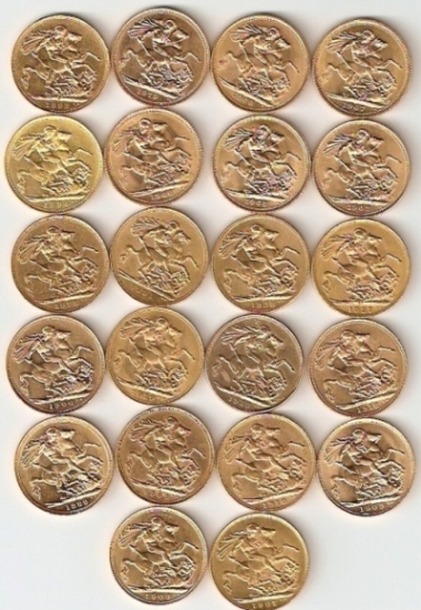 Остались соверены, 20 фр. Франции, Бельгии, Швейцарии, 20 марок Германии, 20 дол. США и др.