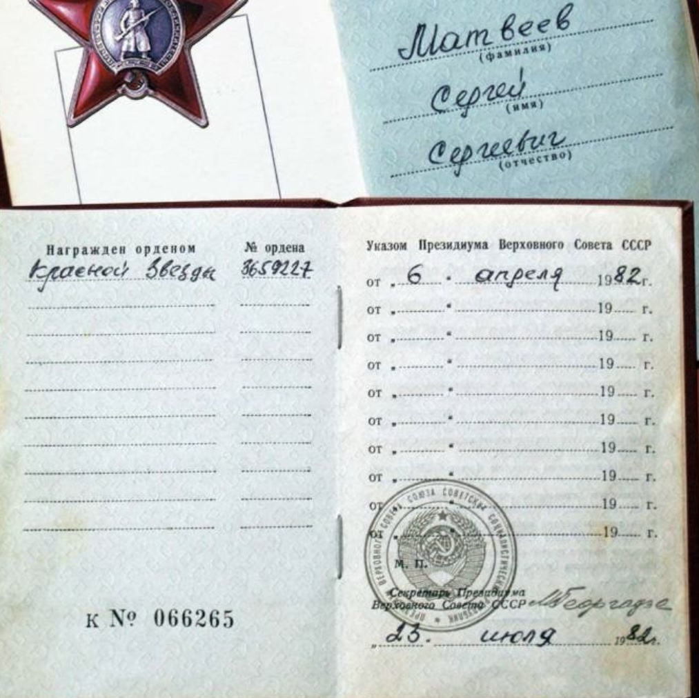 Красного Знамени, Суворова, Кутузова, Богдана Хмельницкого, Александра Невского, Ушакова, Нахимова, Отечественной Войны, Красной Звезды, Славы, За Службу Родине в ВС СССР