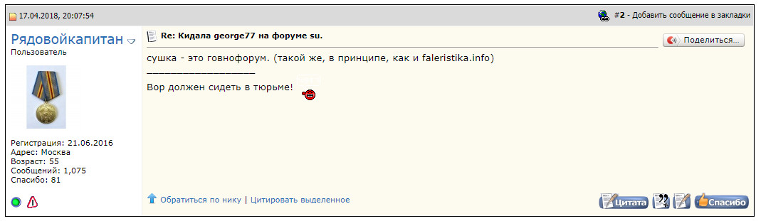 Доброго всем здоровья.Возникла проблема с форумчанином под ником george77.22 ноября ему на карту были переведены деньги в размере 360 тысяч рублей,за два предмета.Предварительно,в личке и на почту,обсудили условия и сроки доставки.Человек согласился.Срок сам определил до трех недель.Доставка должна была быть в США.Взял екстра деньги за это.Всё,что я получил за 5 недель ожидания,так это сообщение с каким то тракингом по России,и то только после моего ему сообщения,что пора внести какую то конкретику.На последующие два сообщения ответа так и не получил.Выводы соответствующие для себя сделал,по этому попросил перевести отправленные ему день обратно.Но похоже,человек решил,что уже все обязательства передо мной выполнил.[am=Vitali]Отправил приглашение в эту тему ему, ждем...[/am]