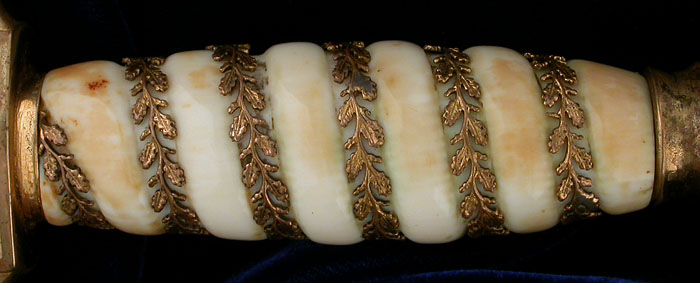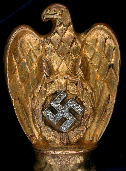 Есть документально подтверждённые факты, что Эикхорн лично вручил Джиму Атвуду их остатки. В последствии он впарил их нашим братьям коллекционерам, и все эти годы они были в коллекциях . (Я лично имею три из них в моей собственной коллекции). Это тот же образец, который упомянут в моей книге о Морских Кортиках на стр. 432. Это типа самый лучший и в супер сохране. На навершие мы видим полузамкнутого крылатого орла, который смотрит на зрителя левой стороной. Орел сжимает венок в когтях. Набор в венке - подвижная свастика. Эта свастика, кажется, сделана из серебра или платины(за такие лаве мог бы и анализ сделать сцуко). В свастике присутствуют 17 брюлов, которые составляют свастику. Каждый брюл - красивый, блестящий драгоценный камень и делает свастику весьма привлекательной, когда на неё попадает свет.