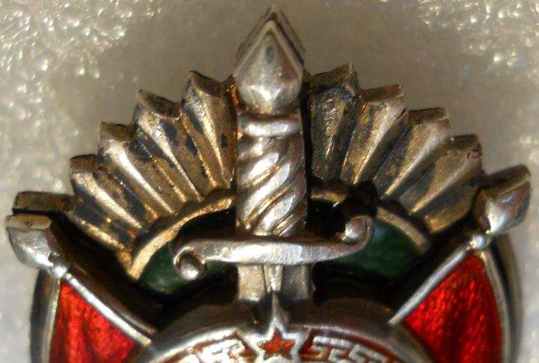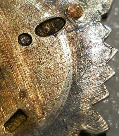 между верхней зарубкой и средний на окончании меча, равномерный овал от расклёпанного штифта.