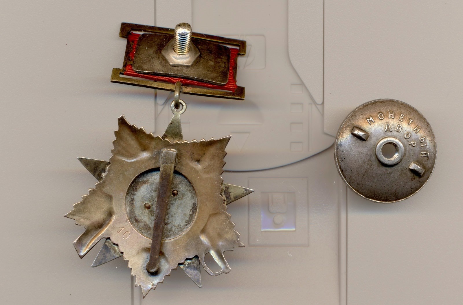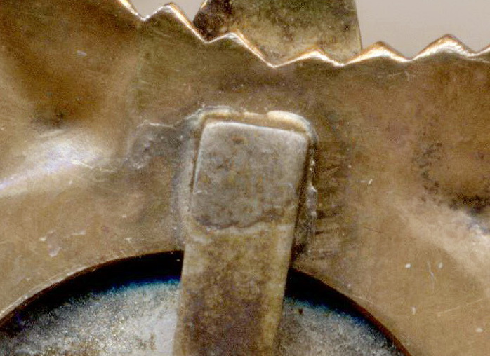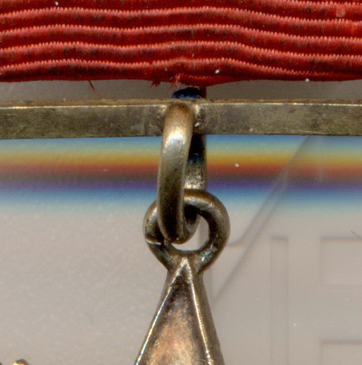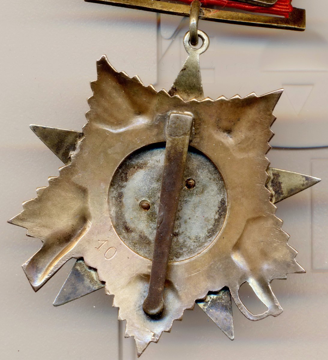 Вариант 1. Подвесная колодка имеет ширину примерно 32 мм и высоту примерно 18 мм. Соединительное звено между орденом и колодкой отсутствует. К подвесной колодке припаяна проволока, которая проходит сквозь ушко знака, а затем загибается в сторону реверса. На реверсе к штраловой звезде вертикально припаяна булавка для дополнительного крепления ордена к одежде (припаяна в точке на 12 часов по циферблату). Минимальный известный номер ордена - 10, максимальный – 617.