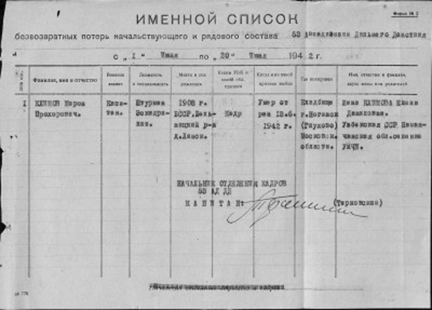 Штурман эскадрильи 1-го Гвардейского авиационного полка дальнего действия Мирон Прохорович Климов во время неравного воздушного боя с немецкими истребителями был тяжело ранен и скончался в госпитале от ран 13 июня 1942 года. Отважный летчик был посмертно награжден орденом Отечественной войны I степени. Эта награда с номером 10 была передана семье героя