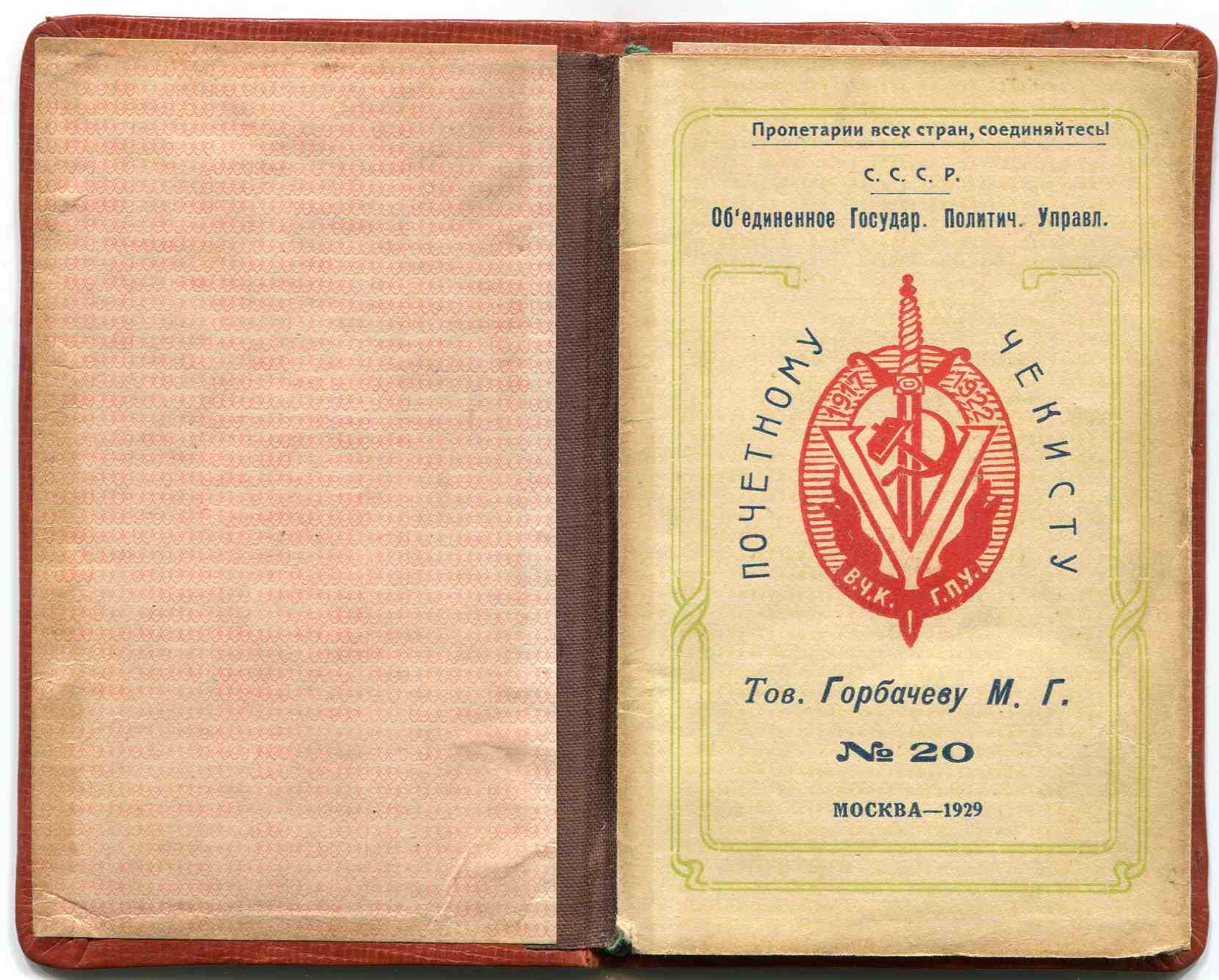 Статут знака "V лет ВЧК-ГПУ" №20 на Горбачева М.Г. в обложке.