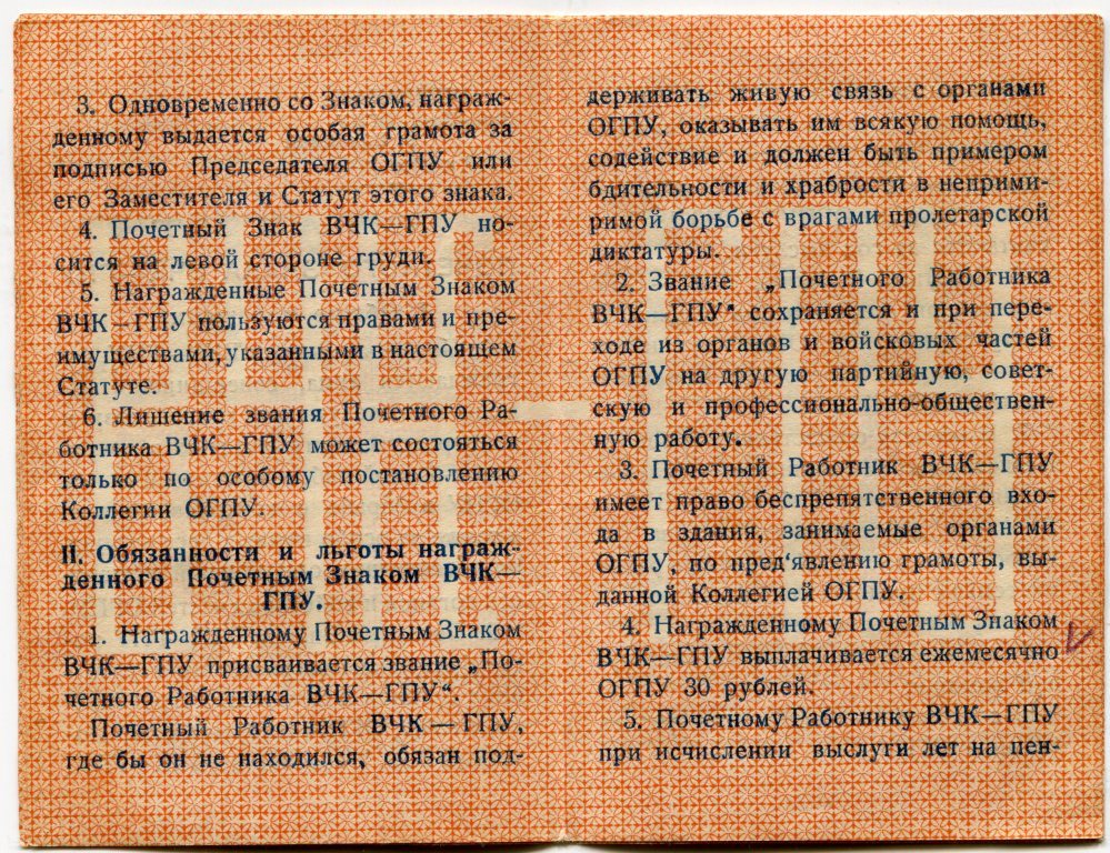 Бонусом к нему - статут знака "XV лет ВЧК-ГПУ" без обложки (только вкладыш).