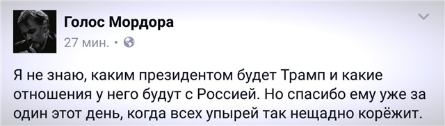 Вы слывете несистемным политиком и обещали сделать Америку великой снова, так вот, желаю вам действовать несистемно и помнить, что величие начинается с мелочей, порой самых неожиданных. Все наслышаны про всесильную руку Госдепа, способной менять неугодные правительства в других странах, пожалуйста, направьте эту руку в сторону Почты России. Пусть эта рука поменяет новую компьютерную программу на старую во всех отделениях почтовой связи. На программу, которая была там до этого и в которую не нужно было вносить кучу строк, а при ее использовании не выстраивались длинные очереди из нервных людей. Я гарантирую Вам, что это будет 100% несистемный ход, и когда люди нашей страны узнают, что президент Трамп решил эту проблему, величие Соединенных Штатов взлетит до таких высот, о которых никто не мог помыслить ранее!
