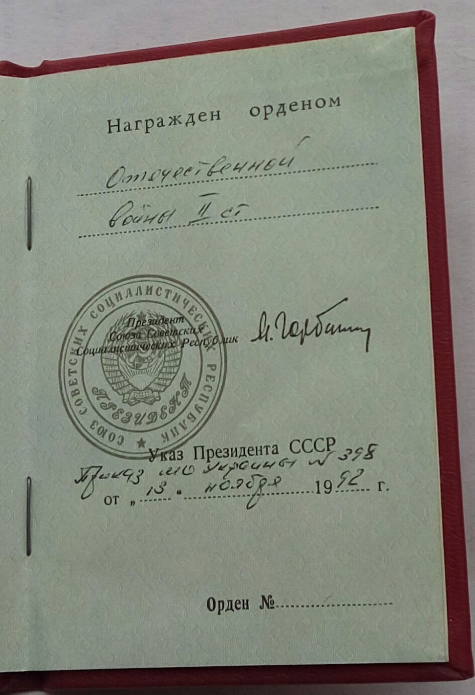 Где данные,что он ВТОРИЧНО был представлен к ордену Славы 3ст. во ВРЕМЯ ВОЙНЫ и тогда приказом министра МО РФ был ПЕРЕНАГРАЖДЁН,вместо второго ордена Славы 3 ст. на орден Славы 2 ст. и причём здесь орденская книжка Президента М.С. Горбачёва,что в 1994г. не было орденской книжки Б.Н. Ельцина.