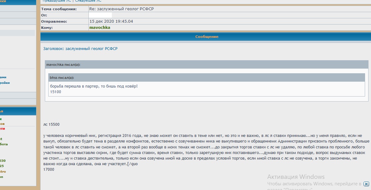 у человека коричневый ник, регистрация 2016 года, не знаю может он ставить в теме или нет, но это и не важно, в лс я ставки принимаю...но у меня правило, если не выкуп, обязательно будет тема в разделле конфоиктов, естественно с озвучиванием ника не выкупившего и обращениемк Администрации присвоить проблемного, больше такой человек в лс ставить не сможет, а на второй раз вообще в моих темах не сможет...до закрытия торгов ставки с лс не удаляю, по любой ставка по просьбе любого участника торгов выставлю скрин, где будет сумма ставки, время ставки, только заретуширую ник поставившего...думаю при таком подходе, вопрос выдуманых ставок не стоит....ну и ставка дествительна, только если она озвучена мной на доске в пределах условий торгов, если мной ставка с лс не озвучена, а торги закончены, не важно когда она сделана, она не участвует.