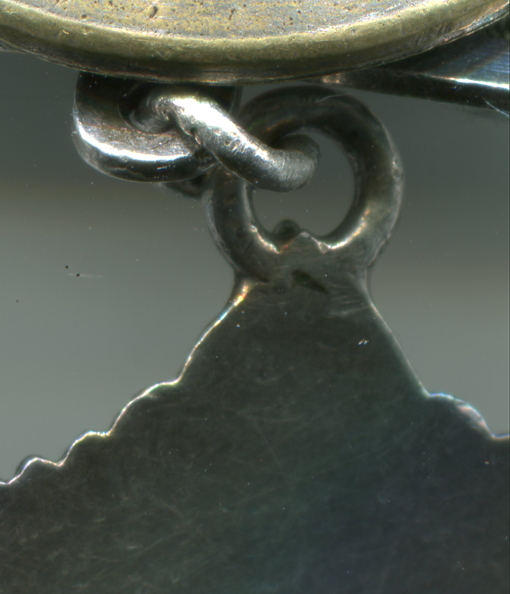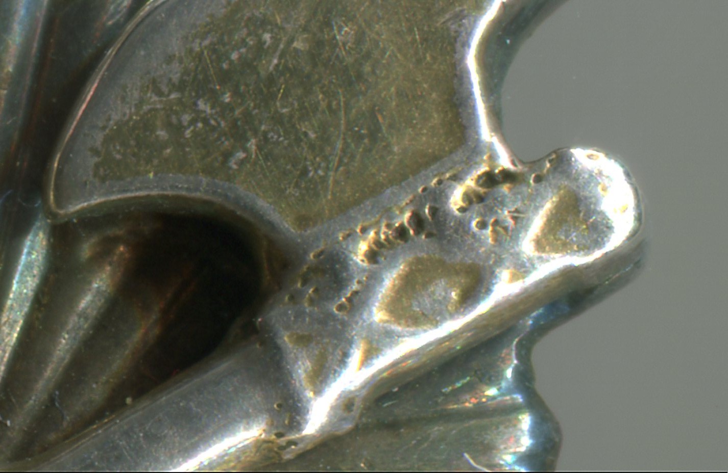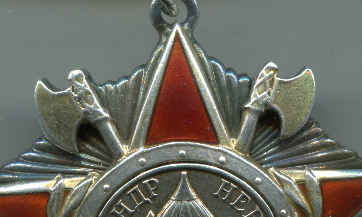2.Пятиконечная звезда с эмалевыми лучами и с изображениями бердышей(топориков),меча,лука и т.д.C ней сложнее.На топориках каверны,как от литья.Значит и сама звезда-литьё,так как топорики неотъемлемая часть звезды.И даже не смотря на однородность патины по торцам в месте,где топорики прижаты к основе.Поэтому и звезда, и топорики, и эмаль, и позолота, и ягоды в венке и всё остальное,что находится на этой части ордена-фуфло.Это так?