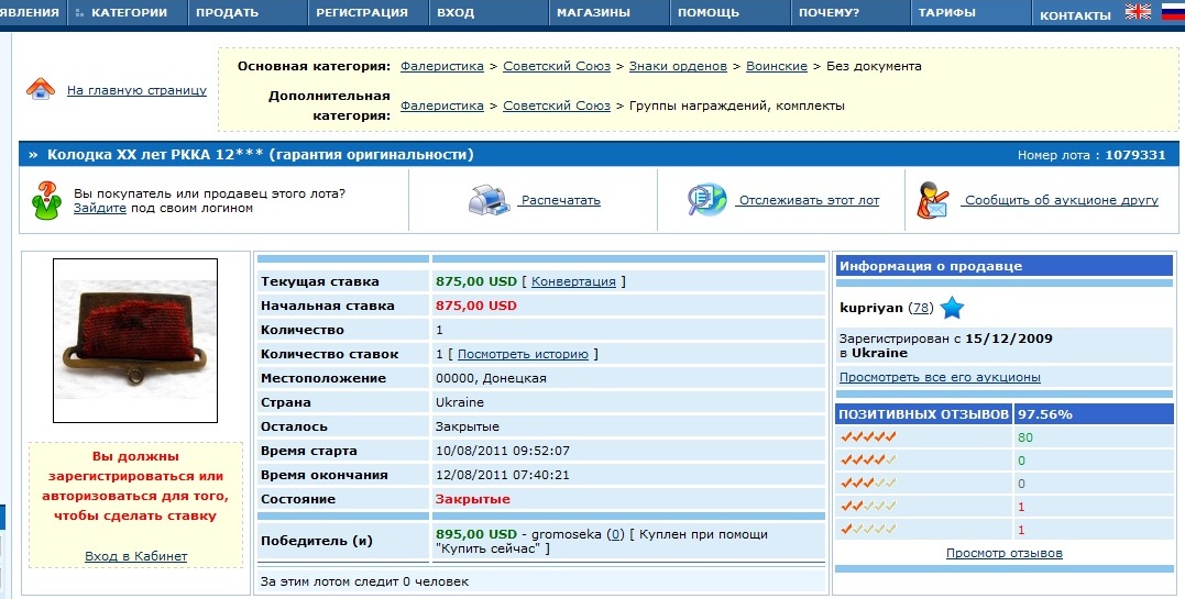 На аукционе господин kupriyan продает нику gromoseka колодку от ХХ лет РККА (прошу заметить, данная сделка ко мне и gremak отношения никакого не имеет) . Колодка выслана покупателю. Все составляющие и сам предмет высылались абсолютно подлинные. Через определенное время начались предъявляться претензии о неподлинности прижимной пластины (первоначально пластина нравилась).