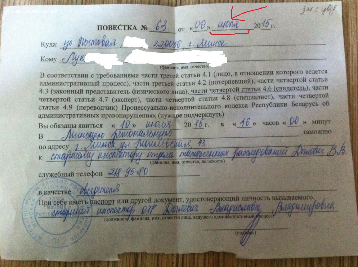 WAN2005 писал(а):Должен сказать, что повестка вполне соответствует и логична по своей сути. И уведомление о направлении материалов в суд тоже. Документ оформлен правильно - там только должен быть угловой штамп и подпись руководителя и именно без указания звания. Внизу могло быть напечатано, кто готовил документ и телефон, но этого нам не видно. Хоть дело и произошло в январе, но машина государственная очень медленная - досмотр, экспертиза, административное дело, может и повторная экспертиза - это занимает месяцы - ничего удивительного, что повестка так сильно отличается по времени от совершения адм. нарушения. Здесь, думаю, всё честно.