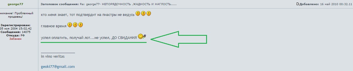 #5421798 Здравствуйте форумчане.Собственно говоря ситуация следующая.Купил у данного форумчанина в личке рубль с этой темы viewtopic.php?p=5410213#p5410213 перевёл ему деньги, как понял что не только я перевел.Перевёл ещё 21 числа.Написал в понедельник "Что по поводу отправки?" в ответ тишина,но сообщение было прочитано.Написал тем людям кто у него тоже купил в теме сказали так же что не слуха не духа от продавца.И тут я сегодня получаю такое сообщение: