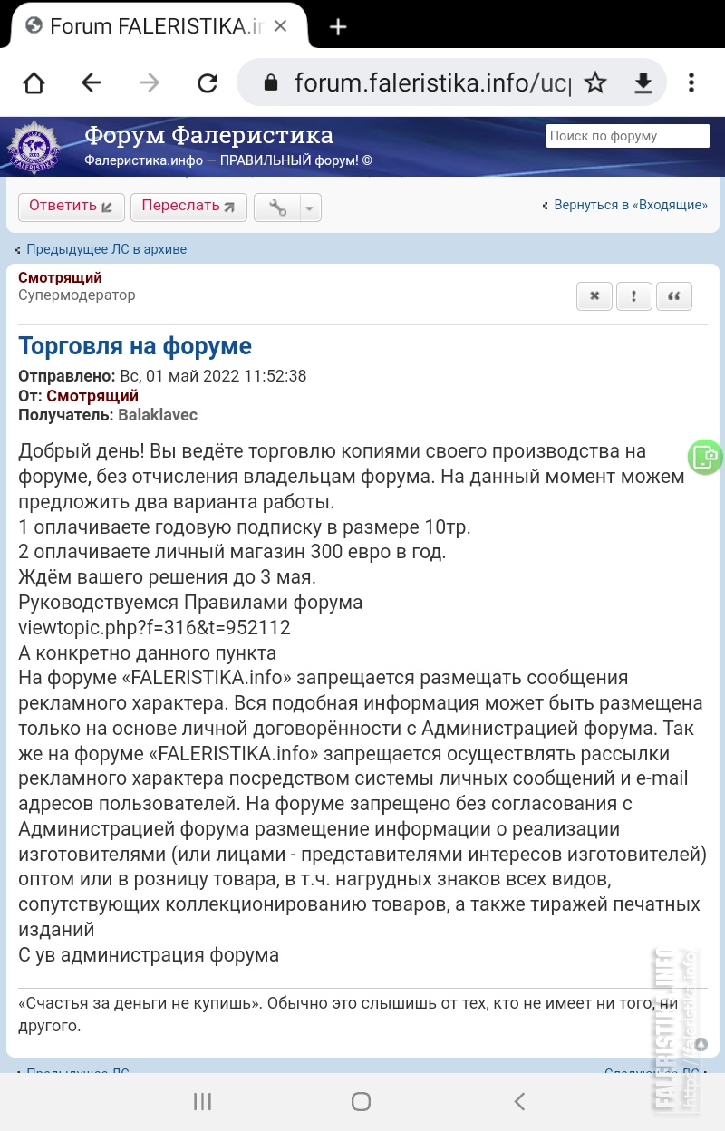 Виталий, а что "причёмного" в данной теме? Ваша цитата сама за себя красноречиво говорит. В данном конкретном случае нет проблем "связанных с торговой деятельностью на Форумах-SU или на Форуме Faleristika.info".