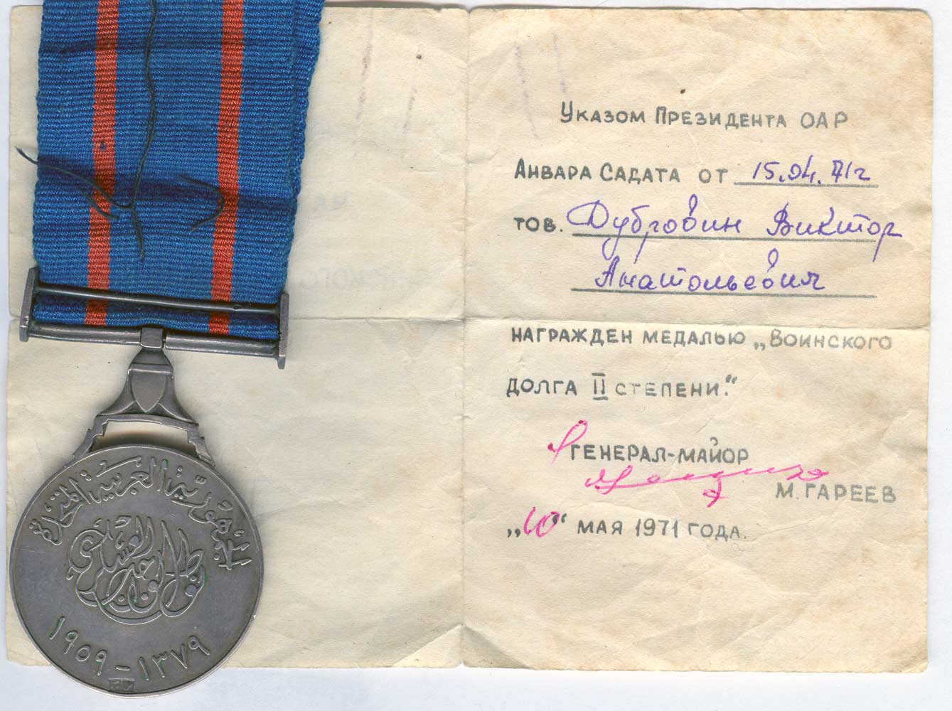 Серебряная медаль с удостоверением, подписанным генерал-майором Гареевым,будущим генералом армии.