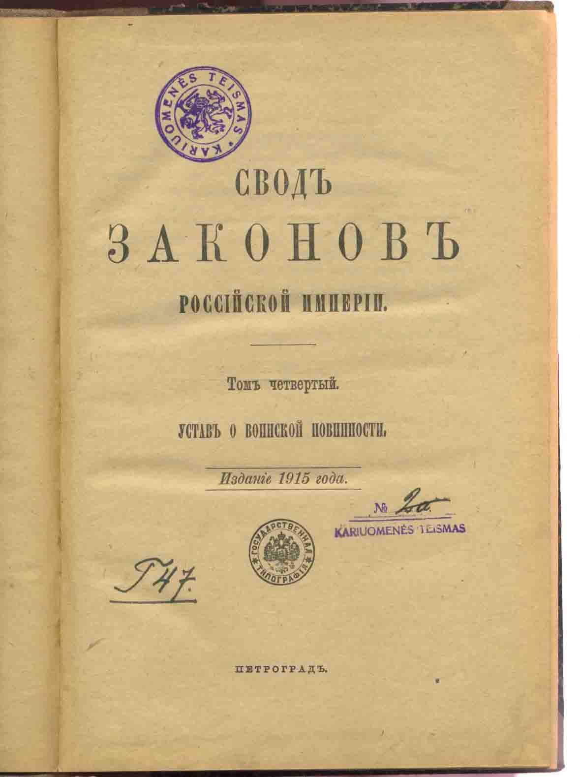 Свод законов1915 Устав о воинской повинности. ladem - 22 мар 2008 12:30.17 × Мини профиль пользователя ladem Сообщения: 606 Зарегистрирован: 03 окт 2005 00:30.45 Откуда: Россия Статус: Не в сети - 22 мар 2008 12:30.17 #827682 Свод законов1915 Устав о воинской повинности. Фиксировано 100 долларов. Фото ladem