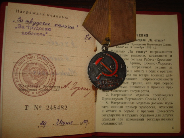 Медали Серп и Молот, За Трудовую Доблесть, За Трудовое Отличие, За Доблестный Труд в Великой Отечественной Войне,За Восстановление Предприятий Чёрной Металлургии Юга, За Восстановление Угольных Шахт Донбасса, За Освоение Целинных Земель, За Строительство БАМ, За Преобразование Нечерноземья РСФСР, За Освоение Недр и Развитие Нефтегазового Комплекса Западной Сибири, Ветеран Труда