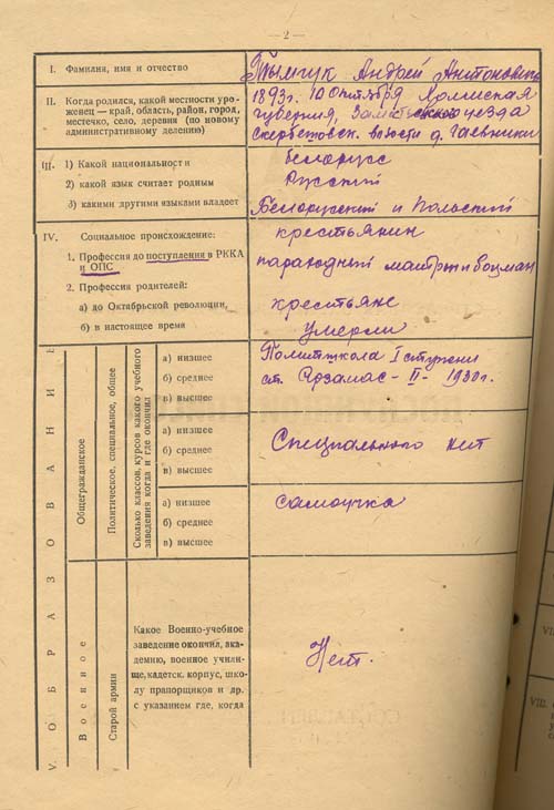 Самоучка. Член ВКПб с 1920-го. Дважды проходил партийную чистку. Начал службу мл.агентом, ...потом - командир отделения, помощник командира взвода, командир взвода, политрук...