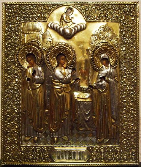 Россия, 1876 год, доска, темпера, чеканный оклад - серебро 84*, клейма на окладе и на каждом венце, Мастер - Виктор Савинков, мастерская работала 1855 - 1888 г.г., Москва - 1876 год., золочение, живопись в очень хорошем состоянии. Очень красивый оклад, детальная проработка. Икона написана по заказу в 1875 году, оклад заказывался под икону и был сделан в 1876 году. Вес оклада 295 гр., Размер: 32 х 27 см.