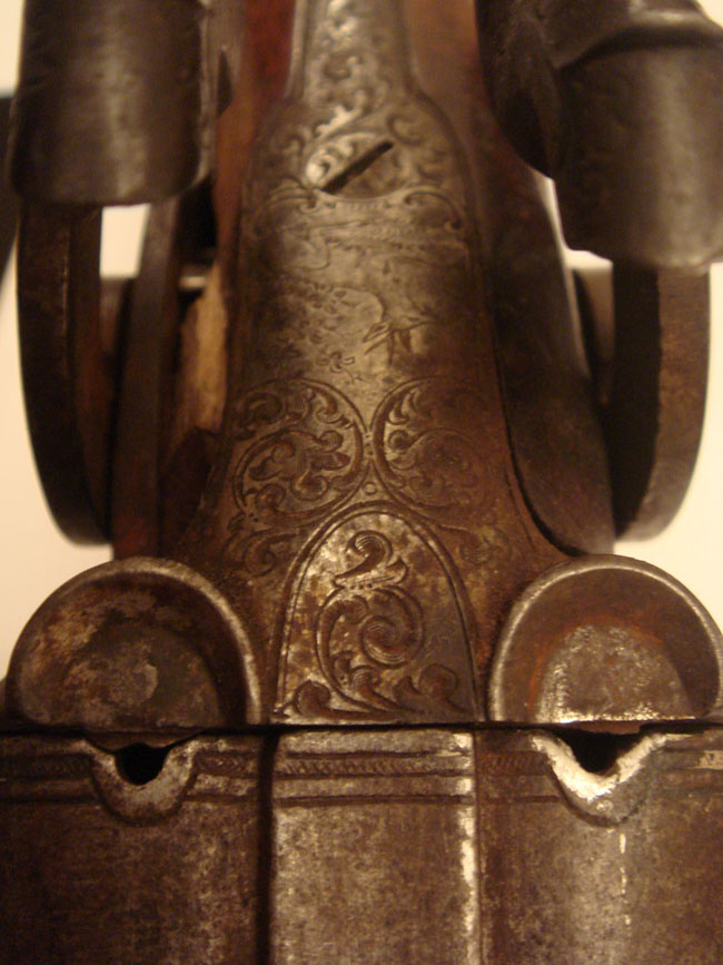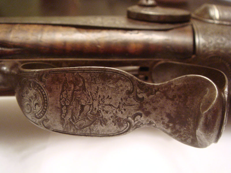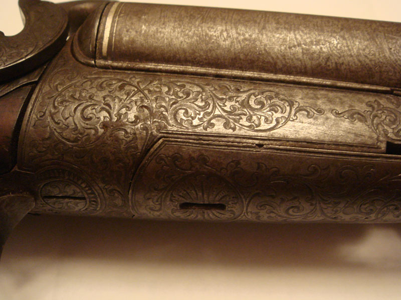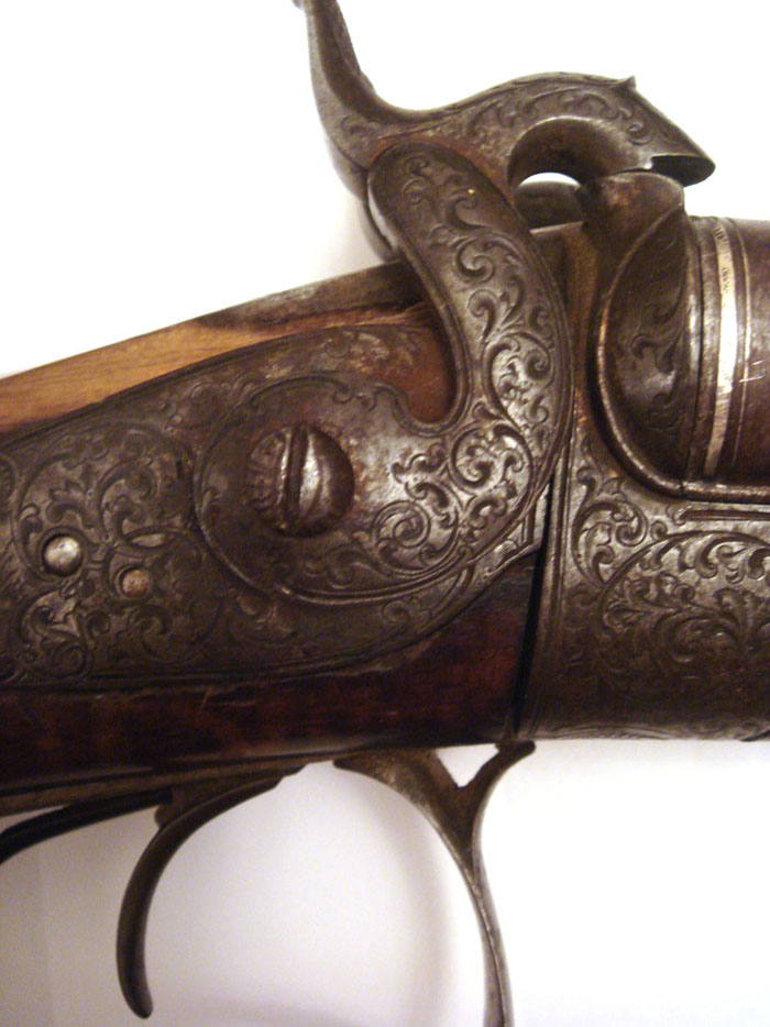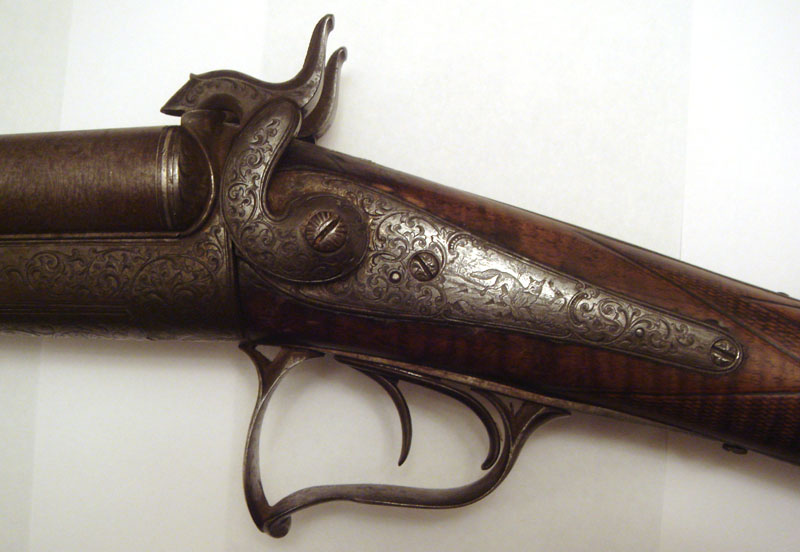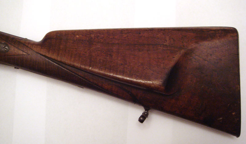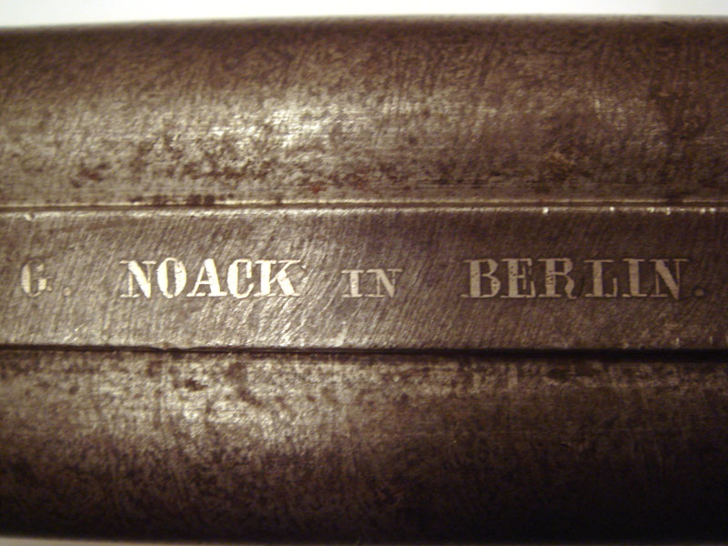 Ружьё G.Noack in Berlin под шпиличный патрон. Ствол - дамаск. Из дефектов - отсутствует пружина в правом курке, над правым курком отколота часть дерева.