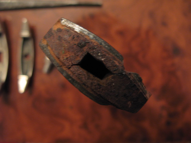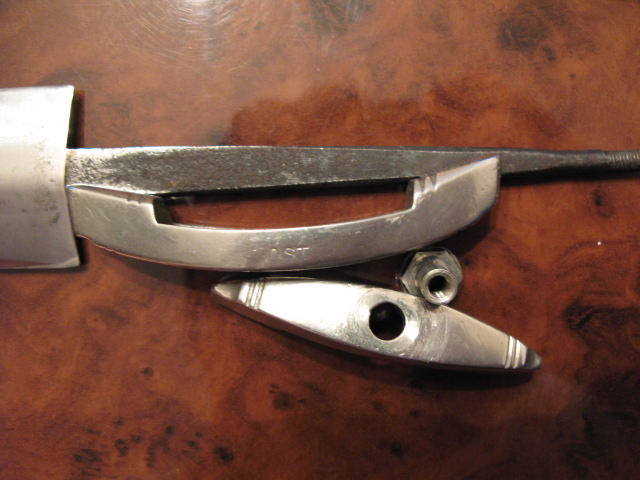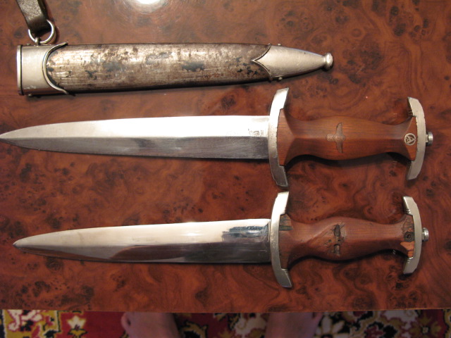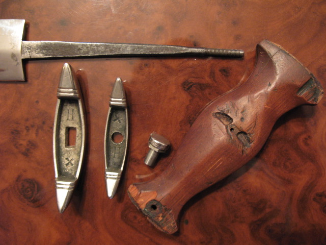 Верхний предмет с ножнами не продается. Лежит для сравнения размеров. Острие клинка сточено. Клинок обработан на шлиф. станке. Толщина клинка заметно не изменилась. Следов надписи и клейма нет. Ножен нет (есть деревянная самоделка). Эмалевая эмблемка есть, но выпадает. Забыл ее на работе. Предмет подлинный. Как оружие отправляют почтой - не имею понятия.