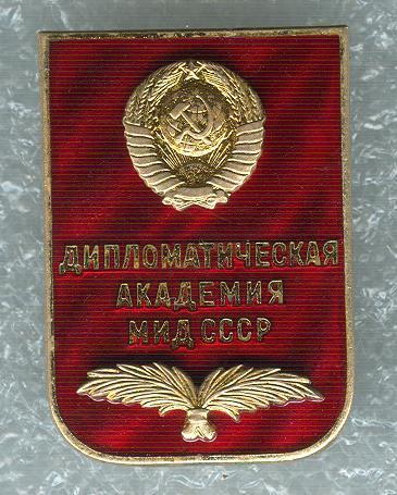 Выпускной знак ДА МИД СССР, вручался по окончанию с 1974 года. Существовал в двух разновидностях, которые отличаются по клейму монетного двора. Обе разновидности здесь представлены. Информация есть в каталоге В. Сидорова "Знаки Вузов СССР", часть 1, стр. 67.