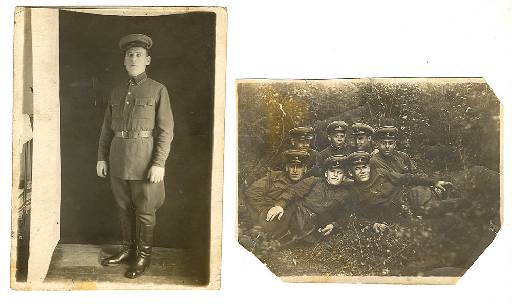 3. 2 фото - буденовки, шинели + доки отец/сын - 8х13см фотки. Диплом на отца. Комсомол.билет на сына. (из взвода разведки) - от 450р.