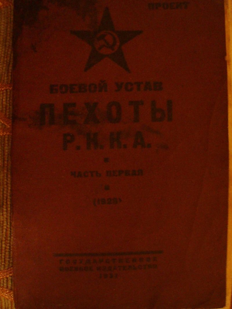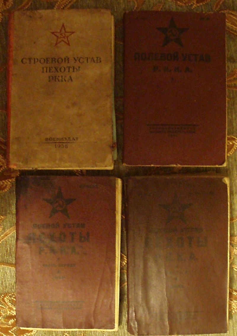 1) Строевой устав пехоты РККА.1938г. 131стр. 2)Полевой устав РККА.1929г. 263стр. 3)Боевой устав пехоты РККА.часть первая. 1928г. изд.1931г. 4)Боевой устав пехоты РККА. часть вторая.1927г.изд.1931г. Потерь нет. Состояние не плохое.