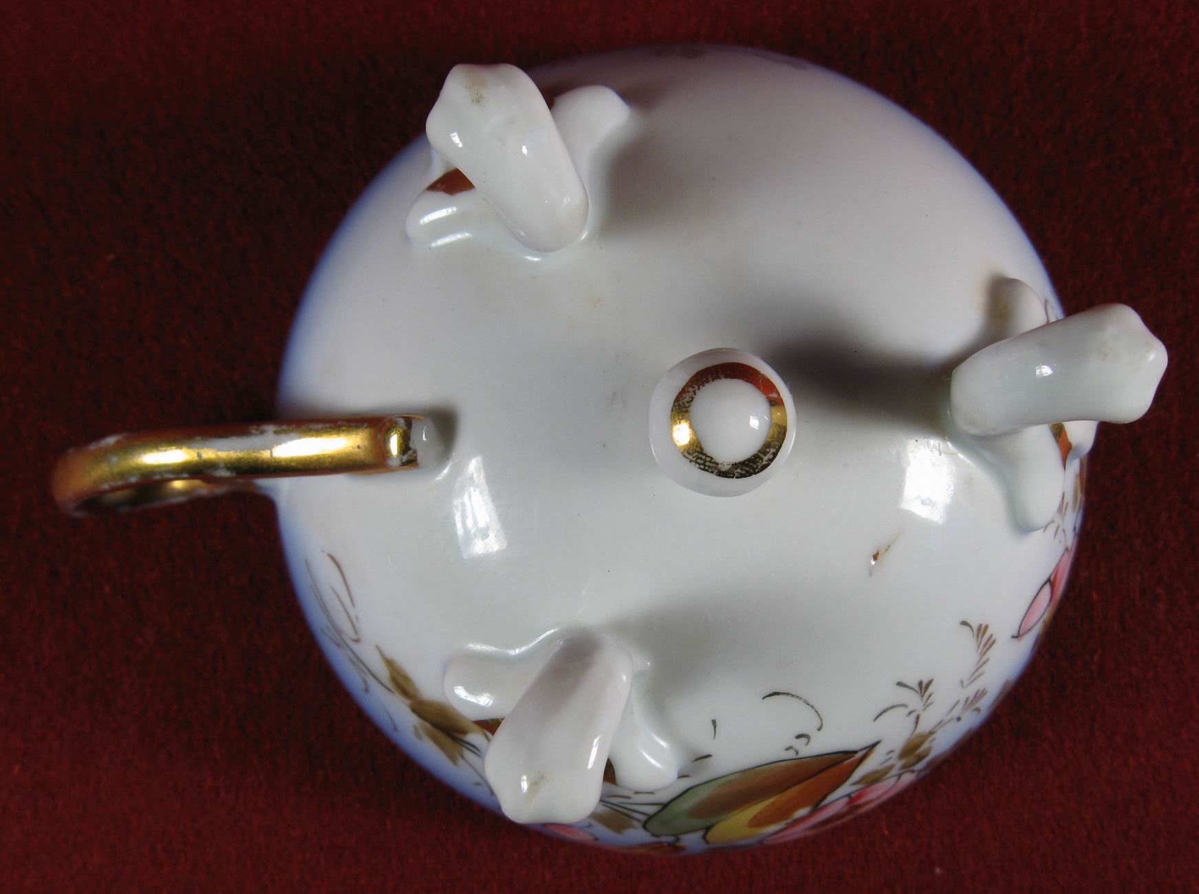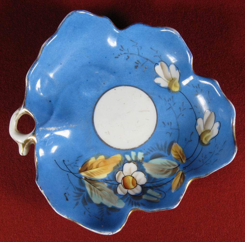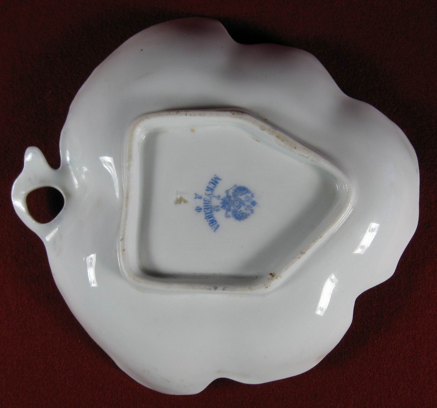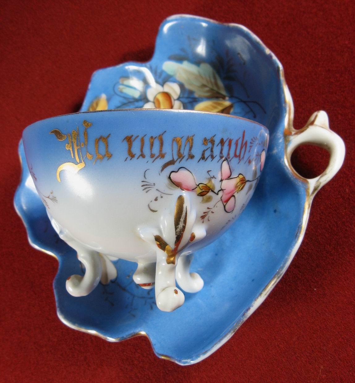 Блюдце в виде виноградного листа, чашка на трех ножках. Поверхность блюдца рельефная (на скане видно) - веточка с листиками. Везде ручная роспись. Одно "но" - на круглом, как у яйца донышке чашки нет клейма. Возможно подбор... кто знает. Но в целом смотрится замечательно... Ширина блюдца по крайним точкам (включая ручку) 15,4 см. Высота чашки с ножками 7,8 см. Сколов и трещин нет, незначительные потертости....