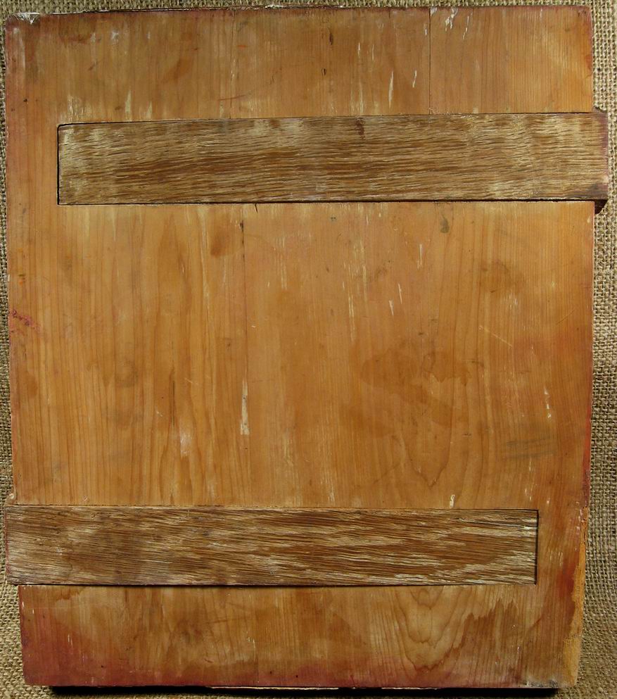 Состояние на сканах... Размер 31,5х27х3 см. Основа "слоеная" - из двух склееных между собой кипарисовых досок. Врезные дубовые шпонки.