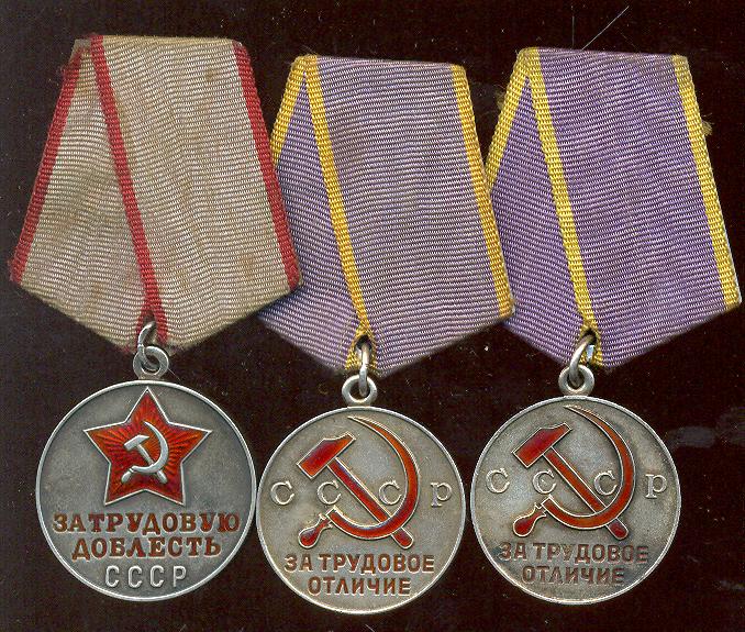 Медали Серп и Молот, За Трудовую Доблесть, За Трудовое Отличие, За Доблестный Труд в Великой Отечественной Войне,За Восстановление Предприятий Чёрной Металлургии Юга, За Восстановление Угольных Шахт Донбасса, За Освоение Целинных Земель, За Строительство БАМ, За Преобразование Нечерноземья РСФСР, За Освоение Недр и Развитие Нефтегазового Комплекса Западной Сибири, Ветеран Труда