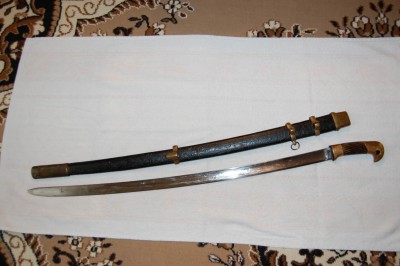 Пришла вот такая. Ножны настоящие, но чем-то покрашены,приборы чесные но в разнобой. На 2-м кольце и сапожке пробито клеймо "А". На устье "О". Длина ножен 900 мм. Шашка казачья. На эфесе буквы "А" и "А" под короной, Злат.Ор.Фабр. На пяте клинка в кружочке "Злат.ОР.Фабр" год. 1908 и 2-й сорт. Длина клина -870 мм, ширина клина 34 мм.Шашка полностью в ножны не заходит,наверное чем-то забито. Делать ничего не стал. ПРЕДЛОЖИТЕ.