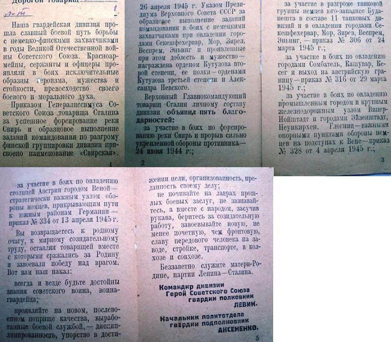 Судя по наименованию и благодарностям это может быть только 98(99 не подходит) гв.Свирская стрелковая дивизия, впоследствии 98 ВДД. А, командир дивизии, ГСС п-к Левин может быть только один,- Семен Самуилович.