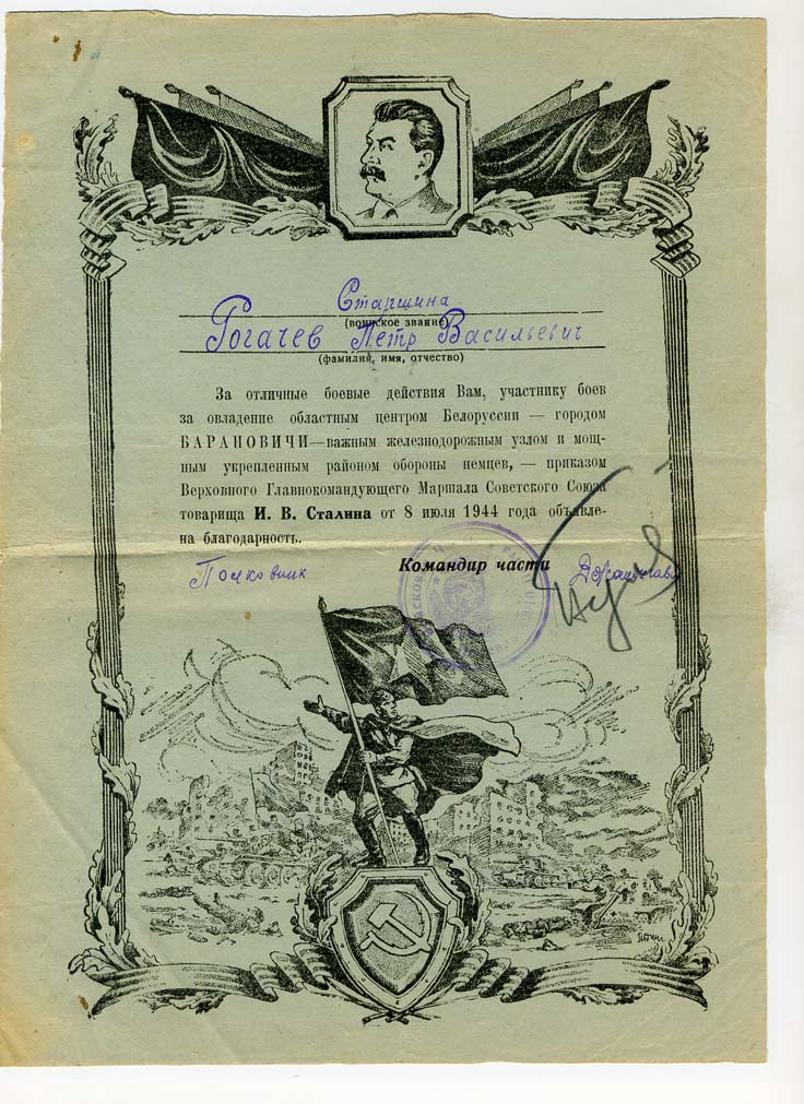 Две благодарности на старшину Рогачева за Белоруссию.