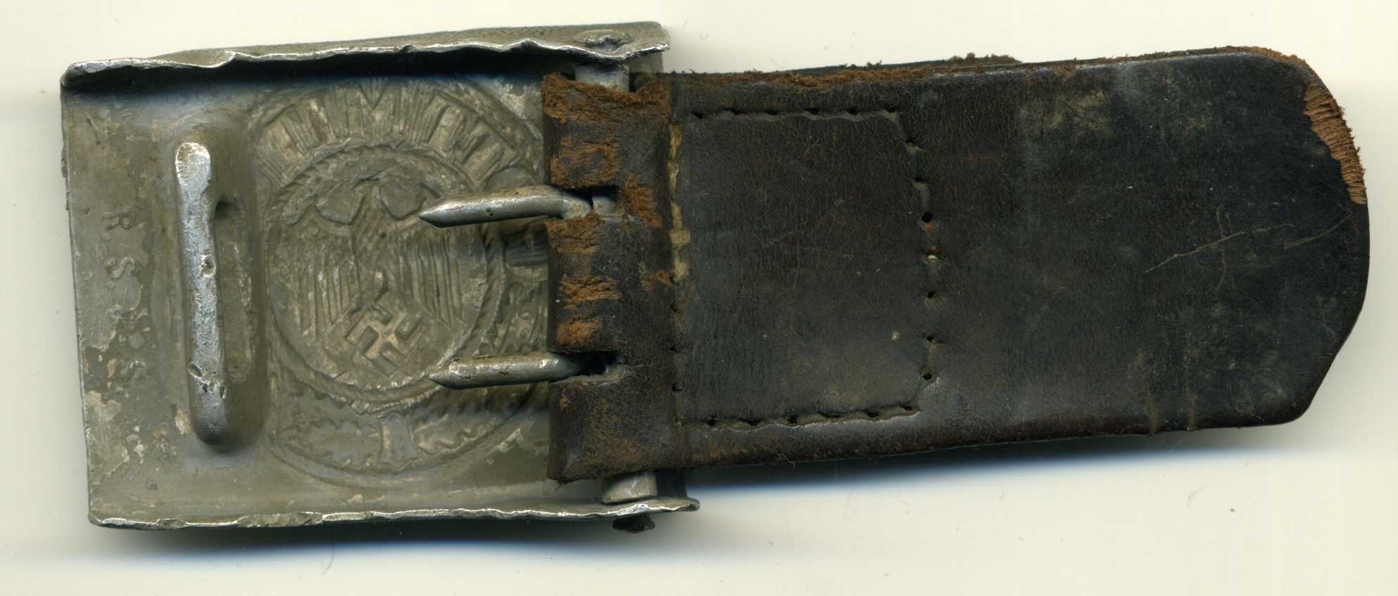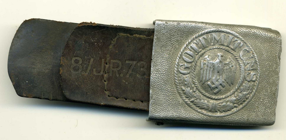 Пряга с хлястиком, алюминий, сохран на скане, на хлястике проштамповано 8./J.R.73 (восьмая рота 73 пехотного полка), и штамп производителя. Датирован - 1937 г.
