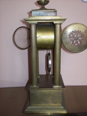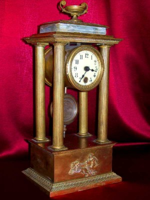 Часы из личной коллекции офицера красной армии(трофейные),привезены из Германии в 1946г. Часы изготовленны из высококачественной латуни. Патина сохранилась. Высота часов 35 см.,ширина 17 см.,глубина 13 см. На верхней части фундамента часов , между двумя передними колоннами имеется выгравированная надпись(5/1. Herrn Max Keller расположена полукругом,под ней надпись z.Frdl.Erinng. под ней следующая 1.4.1882-1.4.1907 и под ней Max Kruger).