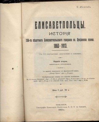 Натиев Д.С. Елисаветпольцы. История 156-го пехотного Елисаветпольского ... полка. 1863-1913. с 112 портр., рис. и план. Изд. 2-е, знач. доп. Тифлис, 1913. 322, 6 с. Без утрат. В хорошем состоянии.