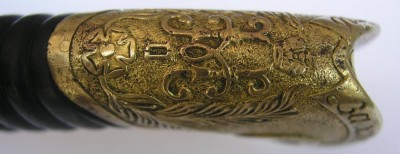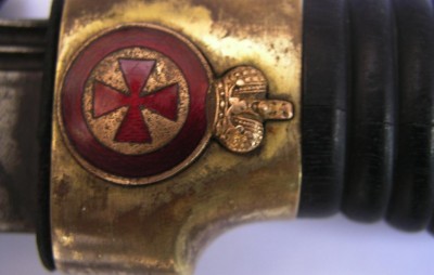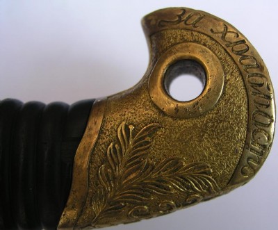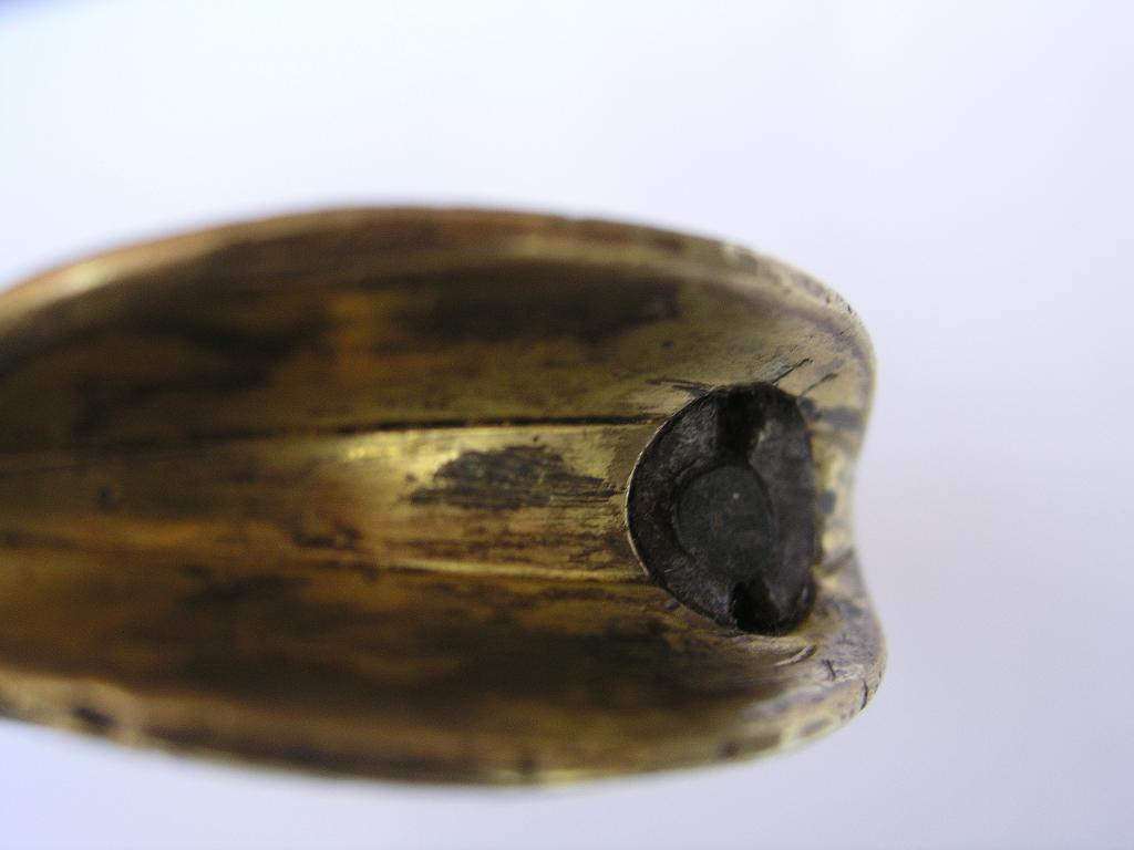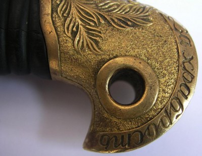 Если не затруднит ответьте : На ножнах есть мелкие круглые дырочки в некоторых местах.. как бы короед проел .... небольшие протертости по коже но уже загрубевшие от вековой грязи.?И если раскручивали предмет.... там под головкой есть овальная пластина с контр гайкой...... есть на ней номер или нет(на пластине).?..Где нибудь на клине остатки хрома присутствуют?