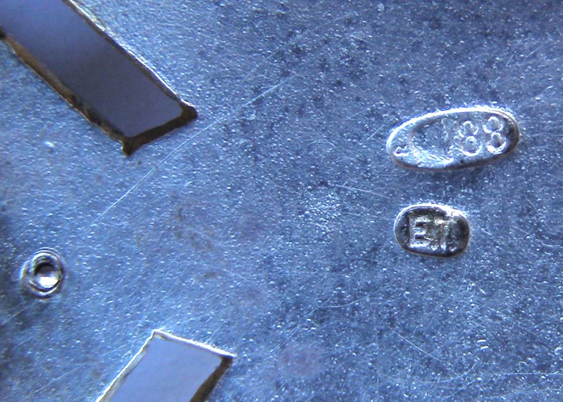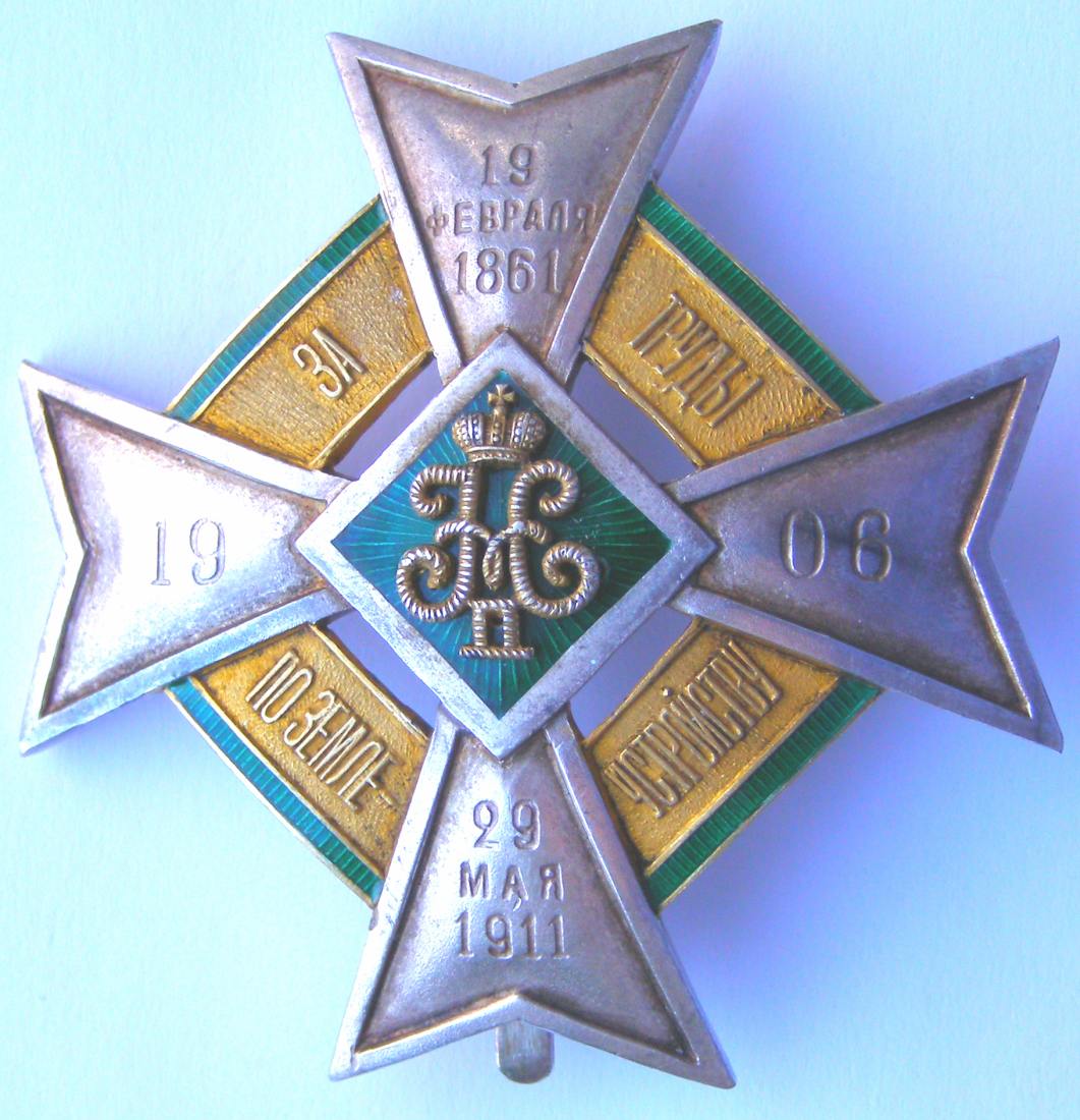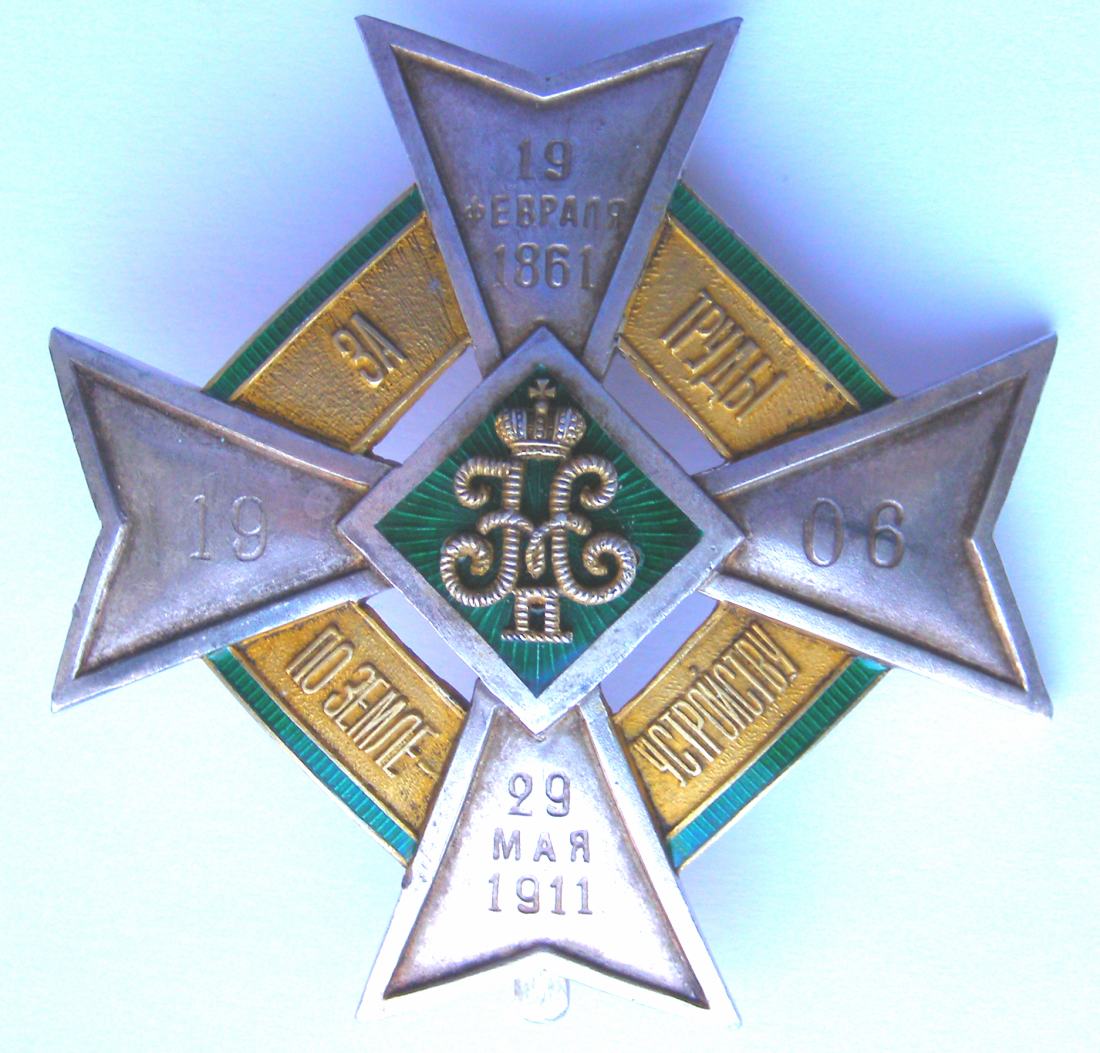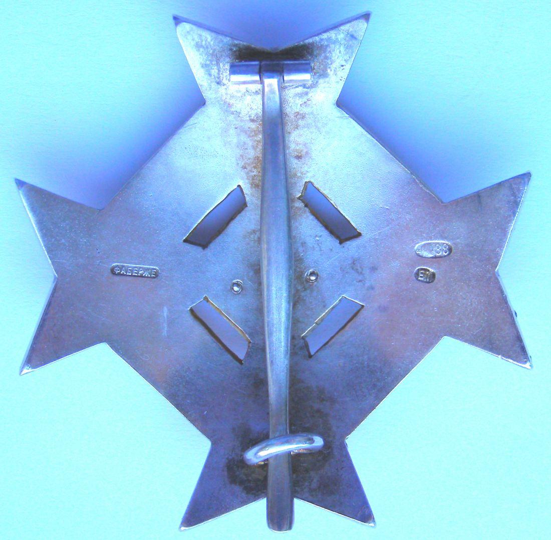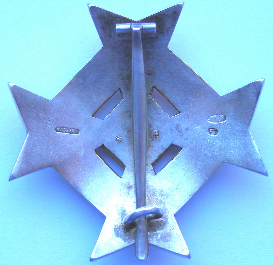 С.-Петербург, 1912–1917 гг. Фирма Фаберже, мастерская «А.Тилеман». Клейма на оборотной стороне знака: справа – СПб окружного пробирного управления с пробой металла в овальном щитке [альфа, женская головка в кокошнике, вправо, 88] и именное клеймо «Е.Т» в овальном щитке; слева – клеймо фирмы «ФАБЕРЖЕ». Серебро, позолота, эмаль, 33,95 г. Размеры 54,5x54,2 мм. Сохранность отличная.