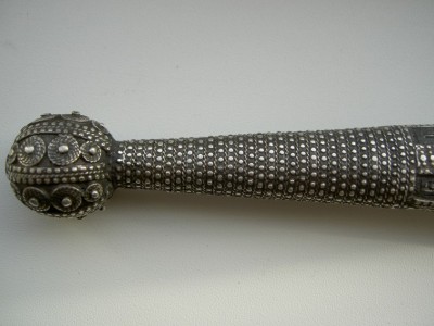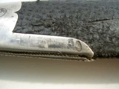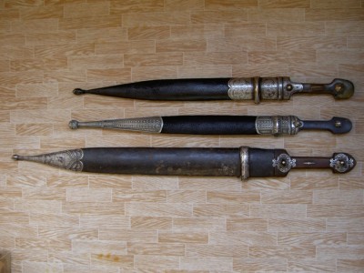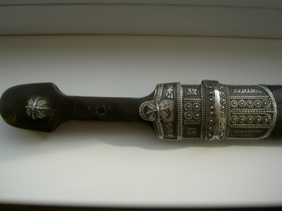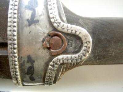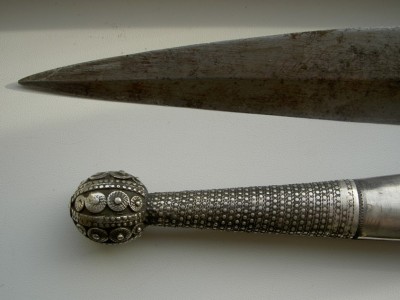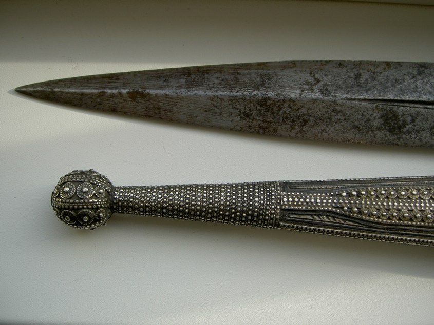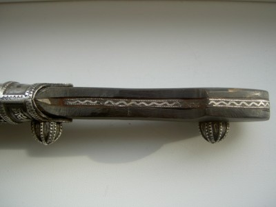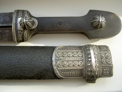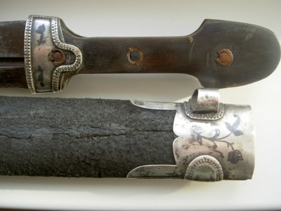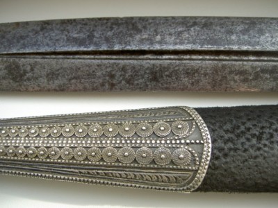 На картинках.Только кожу заменили-старая обветшала.Кинжал красоты необыкновенной.Украшен сканным орнаментом по серебру.Чернь,гравировка,скань,ковка.Изготовлен вероятно очень хорошим мастером-такой красоты работа выполнялась однозначно под заказ богатого человека.Опробирован царской 84-й и именником-для кавказского оружия это также большая редкость и лишнее подтверждение того,что кинжал принадлежал знатному заказчику,так как опробирование серебряных предметов в царской России было делом дорогостоящим.По торцам рукоятка также обкована серебром с чернёным выгравированным рисунком.Размеры предмета в сборе-56см.Ширина клинка-38см.Клин также в прекрасном сохране-без коррозии и рытвин.Цена предмета фиксированная-43000руб. с моей дорогой.