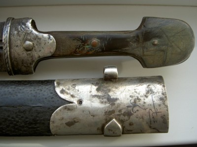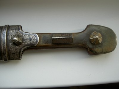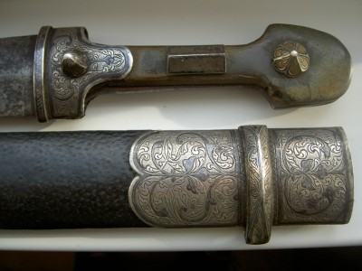 На картинках.Серебро.Чернь.Гравировка.Рукоятка выполнена из роговины.Состояние предмета очень хорошее-всё родное,кроме кожи на ножнах.Клин также в порядке-без коррозии и рытвин.Клеймо мастера на оборотной стороне выполнено чернью по серебру.Длина предмета общая-58см.Ширина клинка-42мм.Цена фиксированная-24000руб. с моей дорогой.