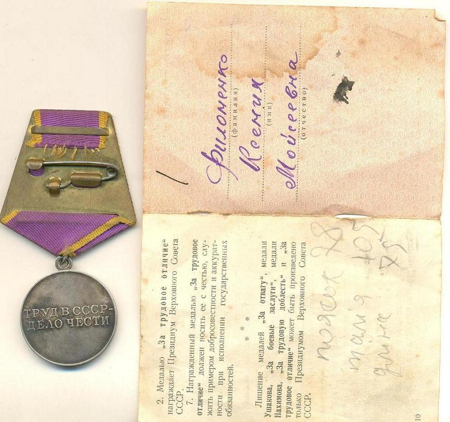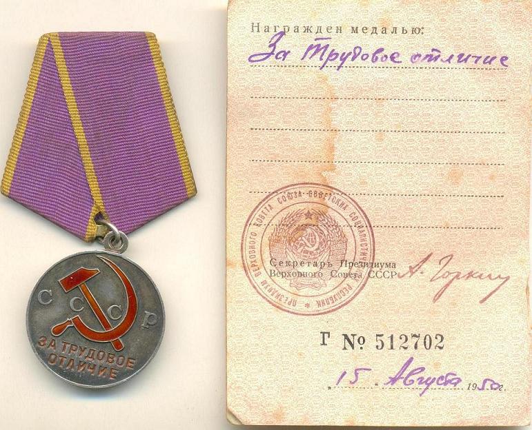 Медали Серп и Молот, За Трудовую Доблесть, За Трудовое Отличие, За Доблестный Труд в Великой Отечественной Войне,За Восстановление Предприятий Чёрной Металлургии Юга, За Восстановление Угольных Шахт Донбасса, За Освоение Целинных Земель, За Строительство БАМ, За Преобразование Нечерноземья РСФСР, За Освоение Недр и Развитие Нефтегазового Комплекса Западной Сибири, Ветеран Труда