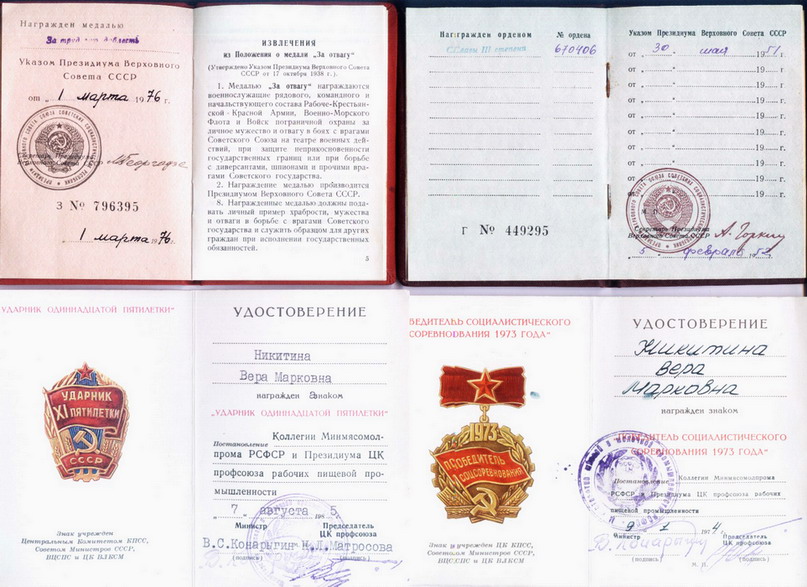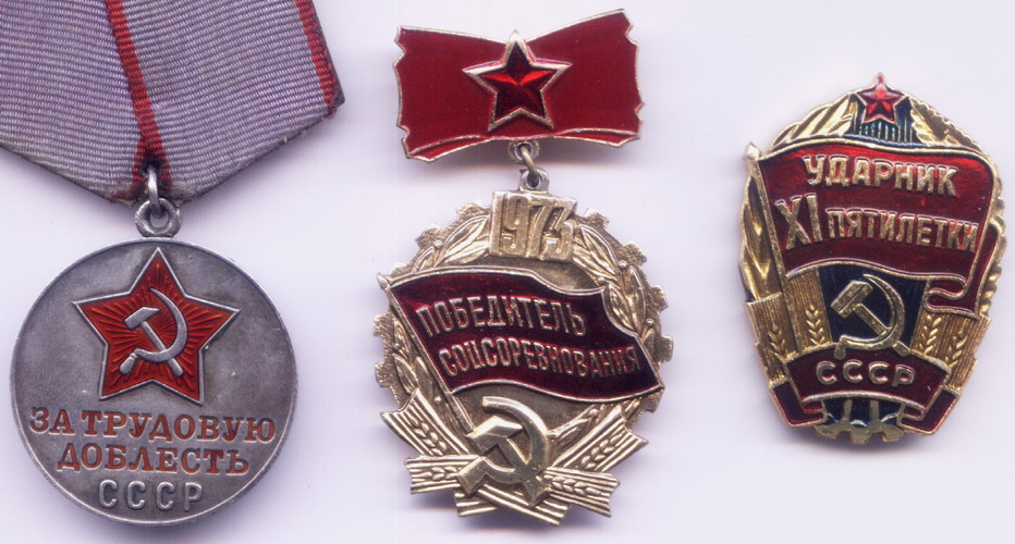 Медали Серп и Молот, За Трудовую Доблесть, За Трудовое Отличие, За Доблестный Труд в Великой Отечественной Войне,За Восстановление Предприятий Чёрной Металлургии Юга, За Восстановление Угольных Шахт Донбасса, За Освоение Целинных Земель, За Строительство БАМ, За Преобразование Нечерноземья РСФСР, За Освоение Недр и Развитие Нефтегазового Комплекса Западной Сибири, Ветеран Труда