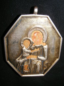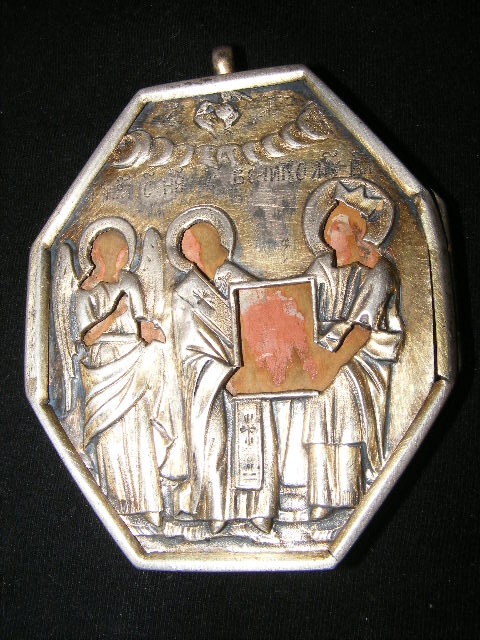Размер с ухом. 90х60 мм.Вес серебряных деталей 43 гр.Клейм не нашёл.Что серебро и не низкопробка-гарантирую!Скорее всего вещь заказная.Первый сюжет-Взыскание Погибших,второй не знаю какой.Судя по остаткам икона была прописана полностью,письмо хорошего качества.