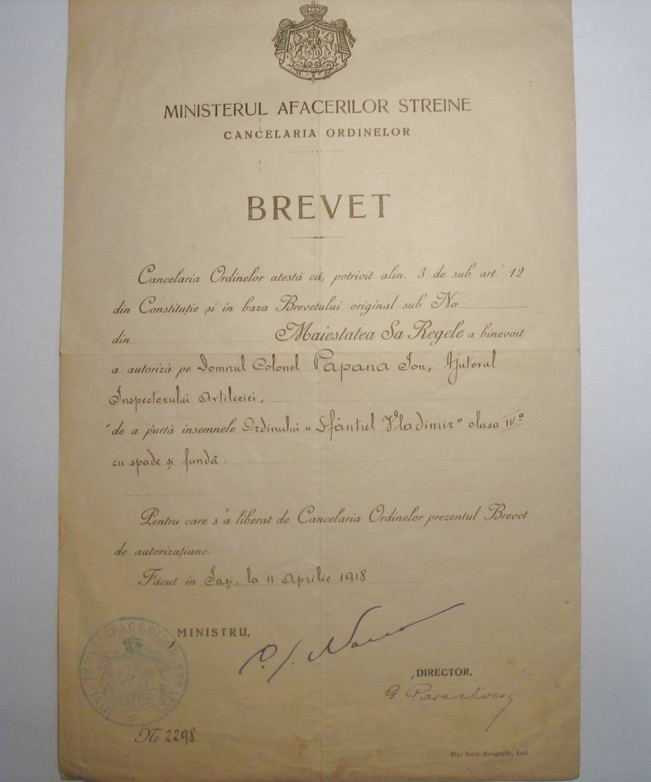 Документ Румынской канцелярии орденов о награждении полковника румынской артилерии Domnul Colonel Papana Jon российским орденом Св. Владимира 4 степени с мечами. Кому интересно предлагайте