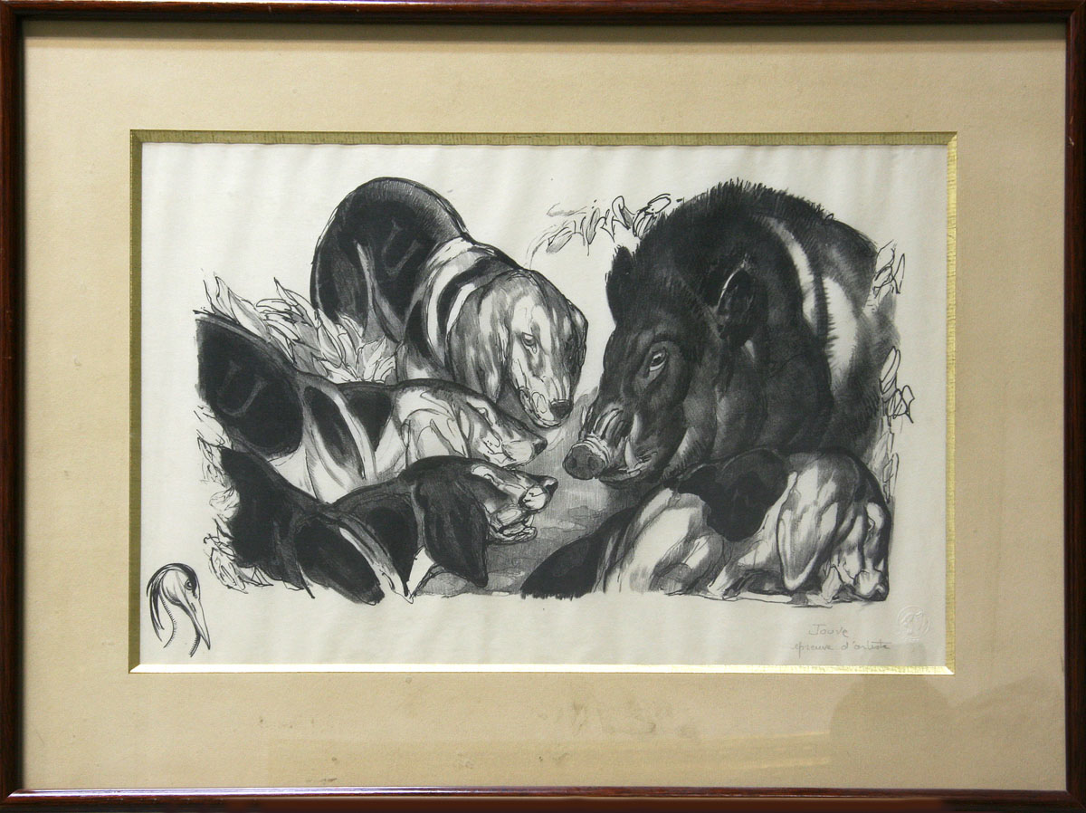 Jouve Paul (1878-1973). Литограф, скульптор, иллюстратор. Сын живописца. С детства изучал ремесло литографа. Пол Джув всегда был очарован животными и изображал их в картинах, скульптуре, рисунках и прежде всего в печатных изданиях. Будучи студентом, он проходил практику в Музее Естествознания и Ботаническом саду в Париже. Бывал в зоопарках Гамбурга, Антверпена. Он получил грант в 1907, чтобы поехать в Северную Африку, чтобы изучать птиц и животных в их естественных средах обитания и был настолько очарован экзотикой Алжира, что остался там на два года. После первой мировой войны Джув возобновил работу над изображением диких животных на бумаге. Он продолжал поездки, чтобы наблюдать птиц и животных в их окружающей среде и изображать их с предельной точностью. Сотрудничал с известным гравером Ф.-Л. Шмидом. Вместе с ним Джув оформлял книгу Киплинга "Джунгли", которая имела большой коммерческий успех. На аукционе Christie's в Париже 20.11. 2009 литография художника "Движущаяся пантера" была продана за 15000 евро.