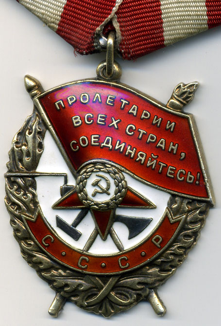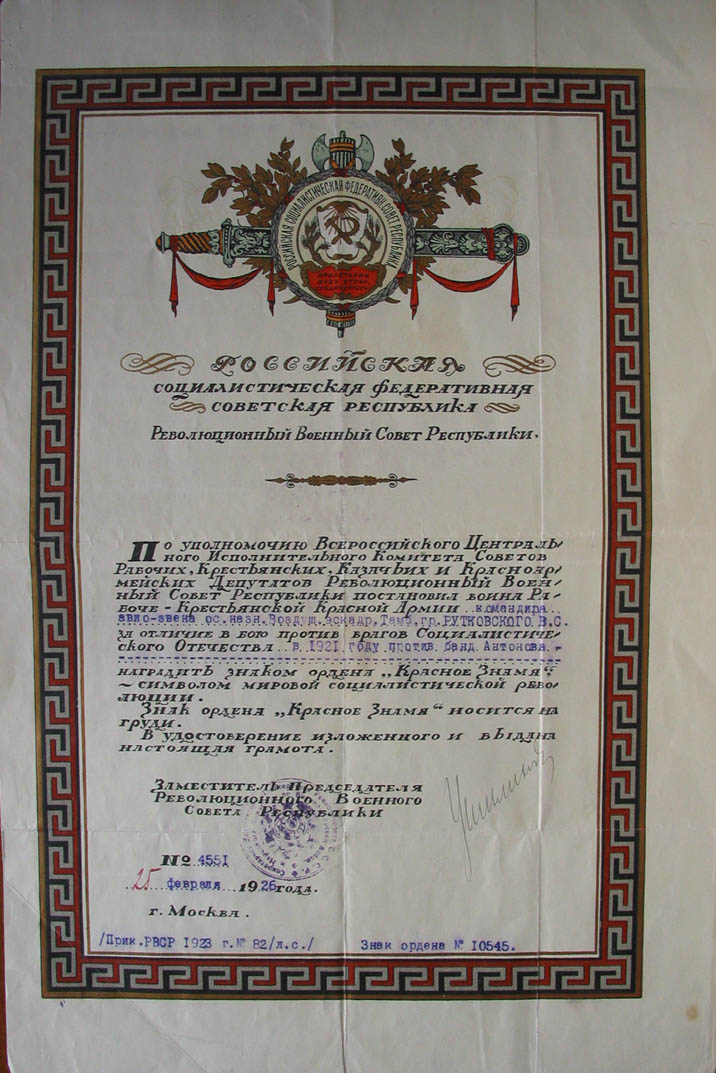 Советские награды: орден Красного Знамени № 10545 «за боевые отличия при борьбе с бандитизмом в Тамбовской губернии» (8.08.1921).