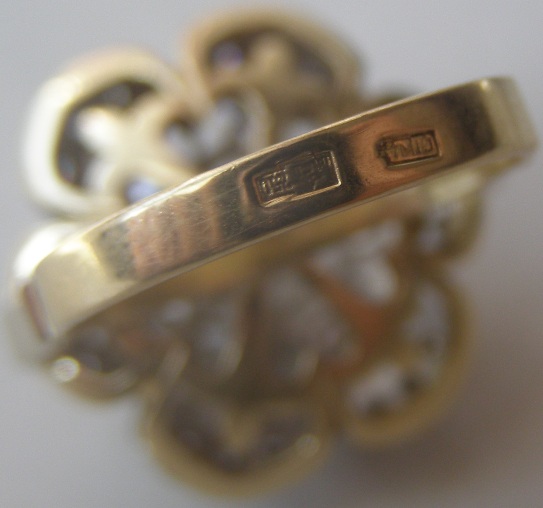 Кольцо, центральный камень 4,35 мм, боковые камни, их 6 (3,6 мм - 2 шт., 3,7 мм - 2 шт., 3,8 мм - 2 шт.), боковые малые их 18 шт. по 1,5 мм.